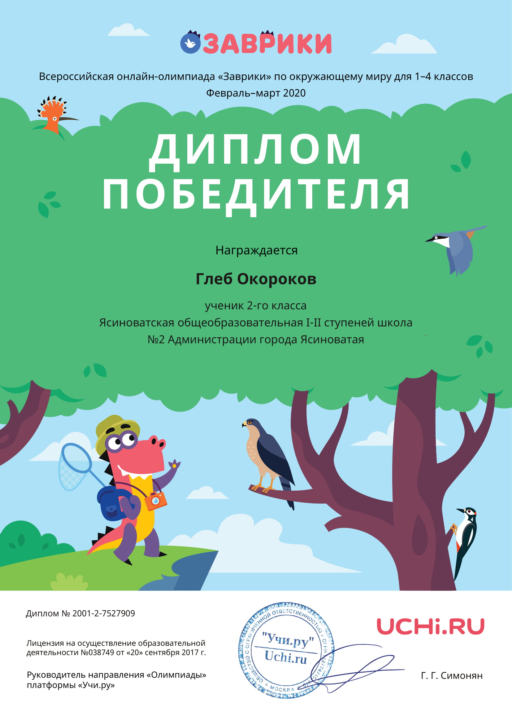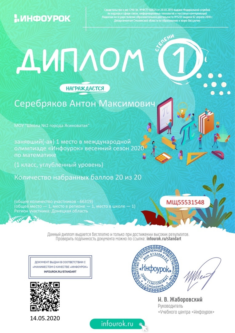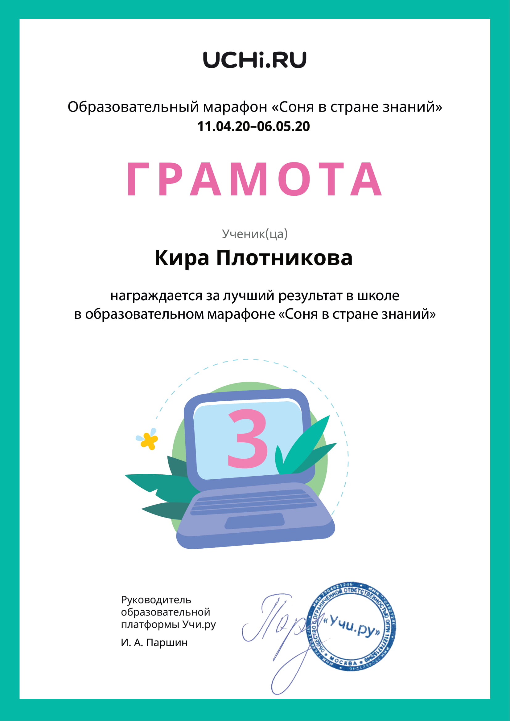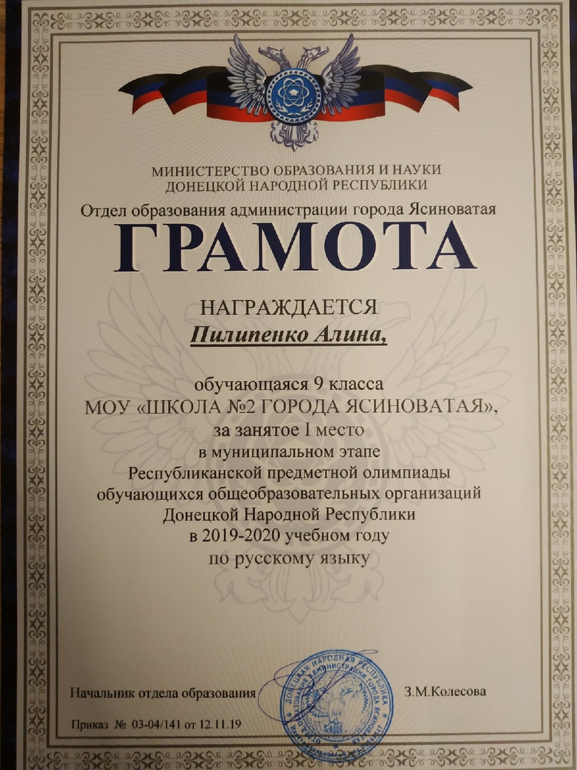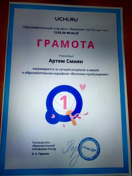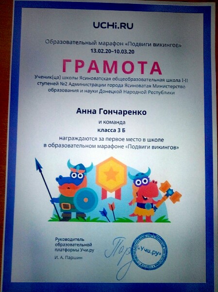 ПОЗДРАВЛЯЕМ НЕСХОДОВСКУЮ СОФИЮ, 1-А КЛАСС, С ЗАНЯТЫМ 1 МЕСТОМ В МЕЖДУНАРОДНОМ ЛИТЕРАТУРНОМ КОНКУРСЕ ДЛЯ УЧАЩИХСЯ 1-4 КЛАССОВ «РАССКАЗЫ Н. Н. НОСОВА» (КЛАССНЫЙ РУКОВОДИТЕЛЬ КУЛИНИЧ ВАЛЕНТИНА ВИКТОРОВНА)